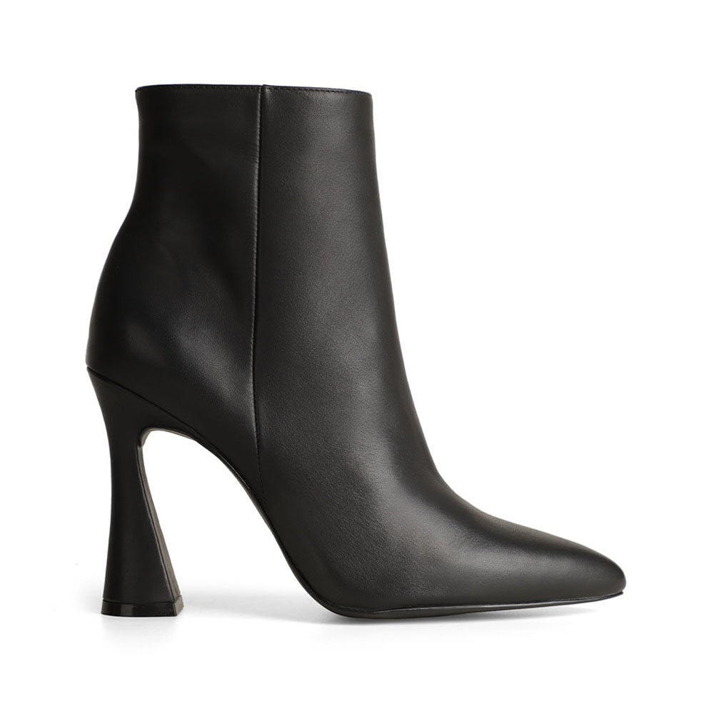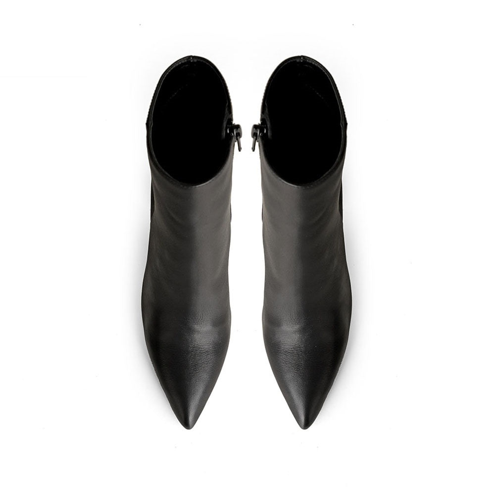 This black leather Juliette boot features a low-cut shaft, pointed toe, and geometric heel. The sleek design offers a modern and sophisticated look, while the high-quality materials provide durability and comfort. Elevate any outfit with these versatile and stylish boots.